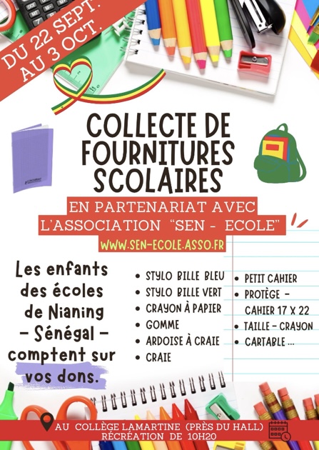 Le collège Lamartine de Houilles organise une collecte de fournitures scolaires du 22 septembre au 3 octobre. Merci d’avance aux donateurs!